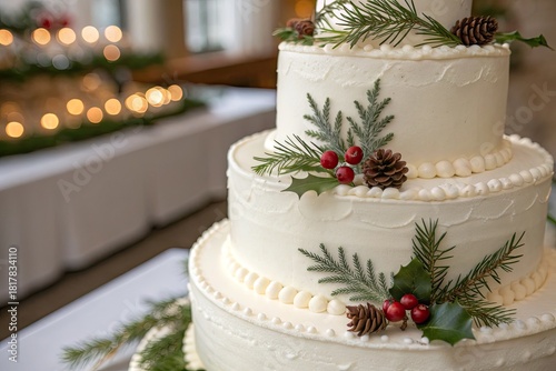 Fototapeta premium Elegant Tiered Wedding Cake Decorated with Holly, Pinecones, and Evergreen...