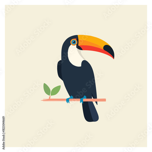 Obraz premium Elegant Toucan Bird Perched on Branch with Leafy Accent - Flat Design...