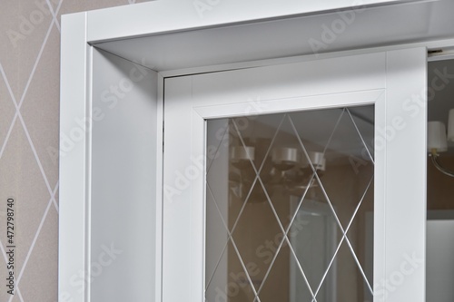 © timltv, Fototapeta premium Elegant trendy inner doors with rhombus pattern on glass surface and silver handles in light spacious room of renovated apartment closeup
