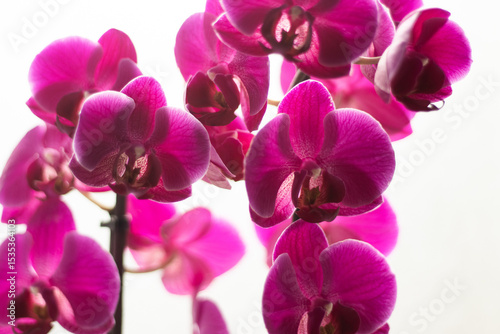 © Arina Cristalova, Fototapeta premium Elegant tropical orchid blossoms in vivid pink shades. Beautiful floral close-up for cosmetic branding, print design, or wedding invitations.