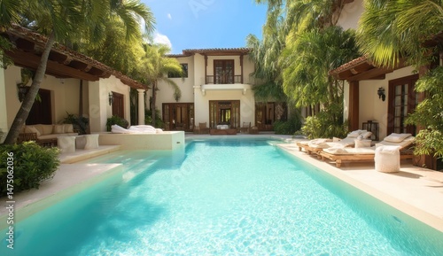 Fototapeta premium Elegant Tropical Retreat with Calm Pool Surrounded by Lush Greenery