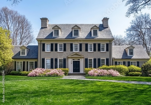 Obraz premium Elegant two-story home with classic architecture, picturesque garden,...