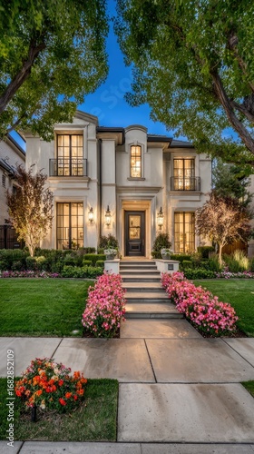© Borsa, Naklejka premium Elegant, two-story home with classical architectural details, manicured landscaping, and a welcoming exterior, bathed in the soft glow of twilight.