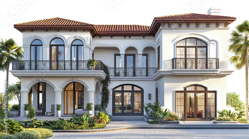 © Thanthara, Fototapeta premium Elegant two story house with arched windows and lush greenery