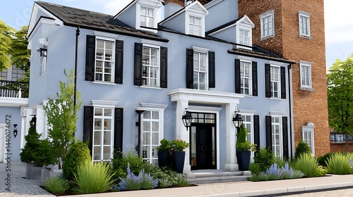 © RAKSIWAH, Fototapeta premium Elegant Two Story Light Blue House with Black Shutters and Lush Landscaping