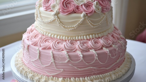 Fototapeta premium Elegant two-tiered wedding cake featuring delicate pink and white frosting with intricate rosettes and pearl accents for a romantic celebration.