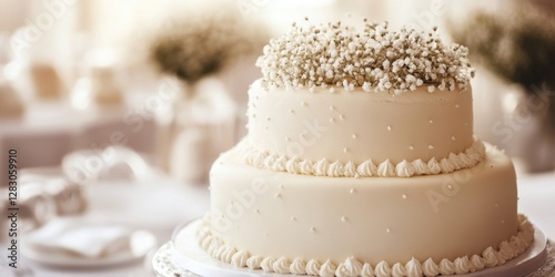 © Gular, Fototapeta premium Elegant two-tiered wedding cake featuring smooth white icing and delicate baby’s breath flowers on top, set against a soft, muted background.