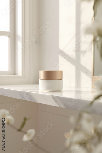 © Rafal Rutkowski, Obraz premium Elegant two-tone container on a marble surface bathed in soft, filtered sunlight, flowers nearby.
