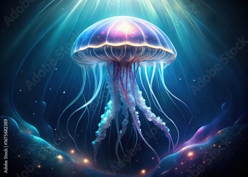 Fototapeta premium Elegant Underwater Jellyfish with Luminous Body and Flowing Tentacles