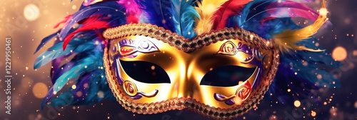 Naklejka premium Elegant Venetian masquerade mask in gold with intricate details, colorful...