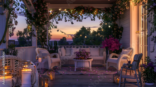 © Pretty Panda, Obraz premium Elegant veranda with white wicker furniture, blooming jasmine, and twinkling fairy lights at twilight