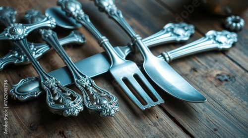 Fototapeta premium Elegant Vintage Cutlery and Silverware Arrangement on Rustic Wooden Table...