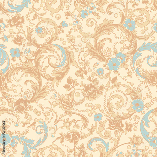 © Mager Man, Fototapeta premium Elegant Vintage Floral Seamless Pattern with Golden Scrolls and Roses.