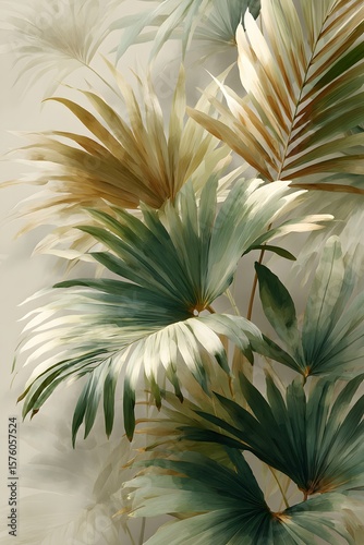© Moritz, Fototapeta premium Elegant wallpaper with a pattern of green palm leaves on a beige background, perfect for adding a touch of nature and tranquility to any space