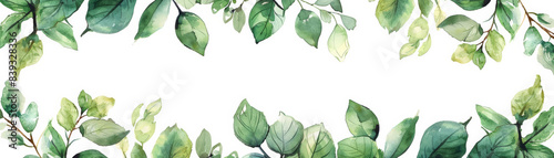 Naklejka premium Elegant watercolor border of lush green leaves on a white background, perfect for nature-themed designs and invitations.
