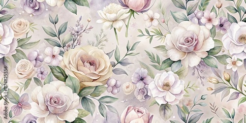 Fototapeta premium Elegant Watercolor Floral Pattern Featuring Delicate Roses and Assorted...