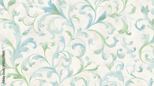 Fototapeta premium Elegant watercolor floral scrollwork design in soft blue and green hues ideal for decorative backgrounds wallpapers and textiles creating a delicate and classic aesthetic