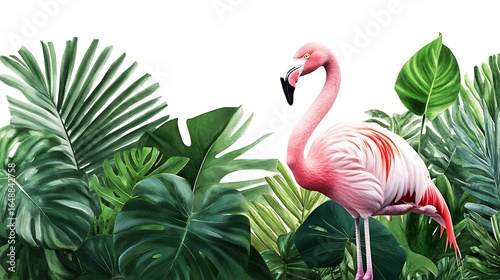 Fototapeta premium Elegant watercolor illustration of a pink flamingo in lush tropical foliage photo