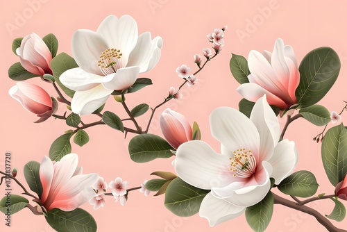 Fototapeta premium Elegant watercolor illustration of blooming magnolia flowers on a soft pastel background.