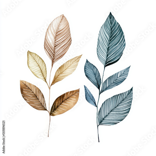 © ธันวา พรหมคำบุตร, Fototapeta premium Elegant watercolor leaves in earthy tones and cool blues, showcasing nature beauty and diversity. Perfect for botanical themes and decor