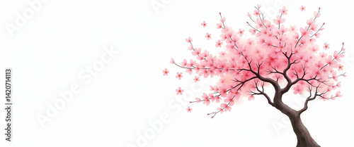 © HaJung, Fototapeta premium Elegant Watercolor Painting of a Single Cherry Blossom Tree in Full Bloom on White Background - Isolated Art Concept with Empty Space for Text or Design