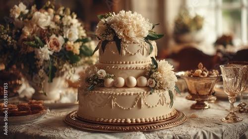 Fototapeta premium Elegant wedding cake decorated with cream flowers on a beautifully decorated table