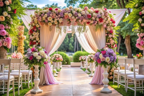 © Curie, Naklejka premium Elegant Wedding Ceremony Floral Decor with Vibrant Arrangements and Copy Space for Invitations and Announcements in Romantic Setting