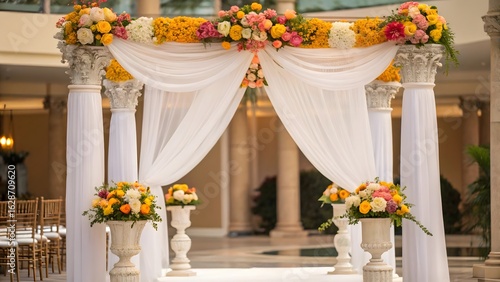 © Hafsa, Fototapeta premium Elegant wedding chuppah decorated with white drapes and colorful flowers