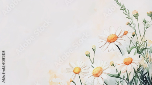 © Teeraphon, Fototapeta premium Elegant wedding invitation card background . Minimal hand painted watercolor Chamomile flowers texture template background. Design for wedding, vip cover, poster, rsvp moderncard.Valentine's Day