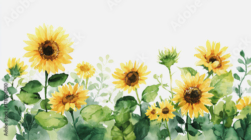 © Teeraphon, Obraz premium Elegant wedding invitation card white background . Minimal hand painted watercolor Sunflowers texture template background. Design for wedding, vip cover, poster, rsvp modern card.Valentine's Day