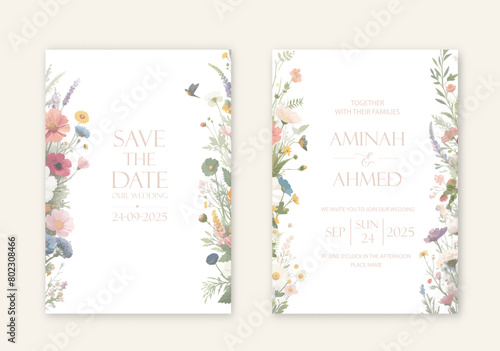 Obraz premium Elegant wedding invites with watercolor flowers on white background.