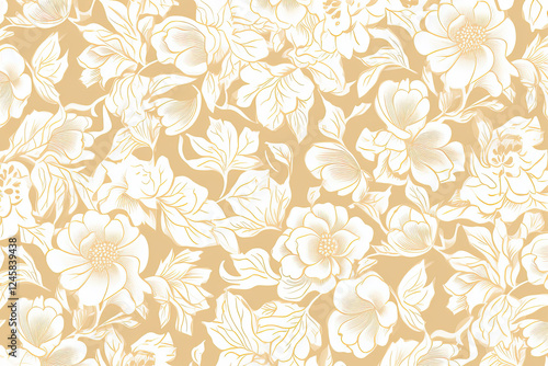 © Ayu Triyuniarti, Obraz premium Elegant White and Gold Floral Pattern on Beige Background