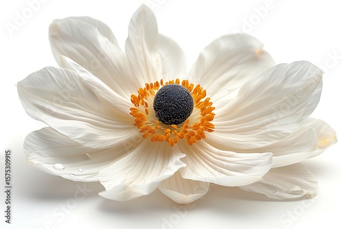 © Creative Laik, Fototapeta premium Elegant White Anemone Flower with Black Center and Orange Stamens on White