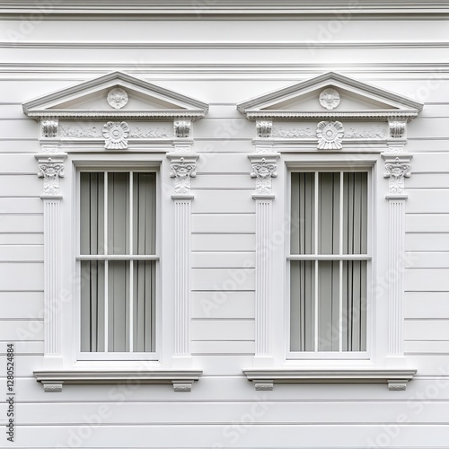 Fototapeta premium Elegant white architectural windows with decorative moldings showcasing...