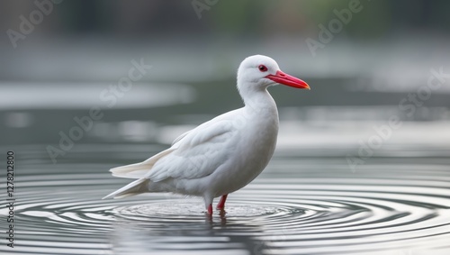 © The 2R Artificiality, Fototapeta premium Elegant white bird with a striking red beak standing gracefully in calm water, surrounded by subtle ripples and a tranquil background.