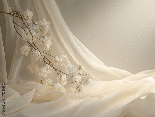 © Stefan, Fototapeta premium Elegant White Blossoms on Silky Fabric: A Serene and Pure Floral Arrangement