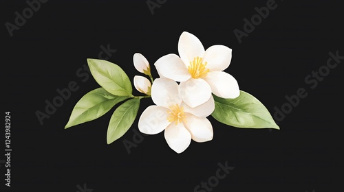 © Biggy, Obraz premium Elegant White Blossoms with Green Leaves on Dark Background