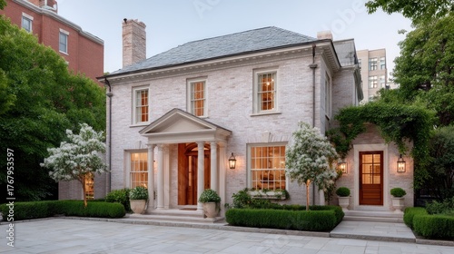 © ravyanatalie, Obraz premium Elegant White Brick Manor House In Classic European Style Surrounded By Lush Green Trees And Manicured Bushes With Warm Interior Lighting On A Clear Evening