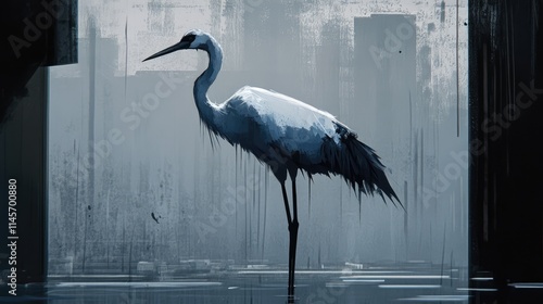 Fototapeta premium Elegant white crane standing majestically in a serene urban landscape with abstract elements reflecting a connection to nature amidst city life.