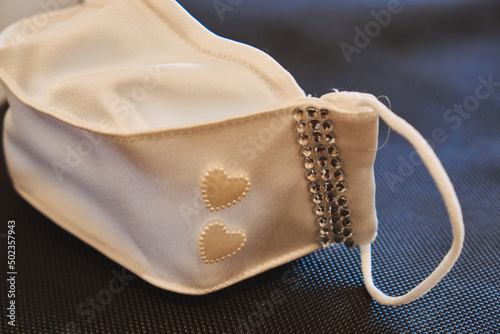 Fototapeta premium elegant white decorated mask to prevent covid used in a wedding on a white...
