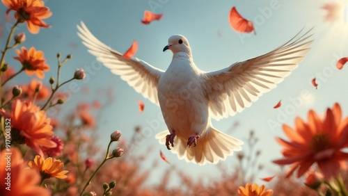 Obraz premium Elegant White Dove in Flight Among Colorful Flowers