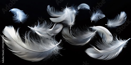 Fototapeta premium Elegant White Feathers Floating on Black Background - Stock Photo