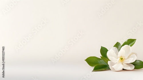 Fototapeta premium Elegant white flower with green leaves on soft background