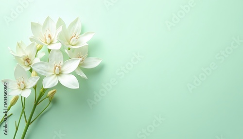 © Creative Studio, Fototapeta premium Elegant White Flowers on Light Green Background with Open Space
