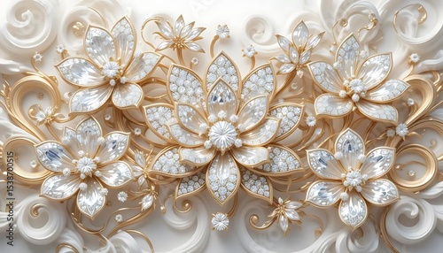 © Evi, Obraz premium Elegant white flowers with gold accents and crystal embellishments in luxurious 3D style. Perfect for wedding decor, luxury branding, or background designs.