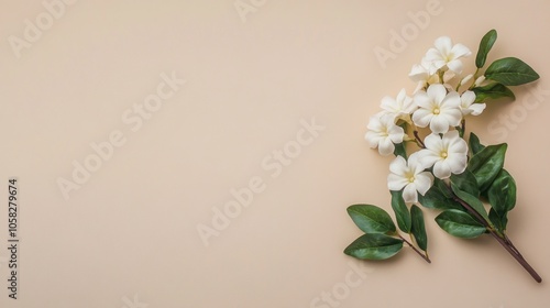 Fototapeta premium Elegant white flowers with green leaves on a soft beige background.
