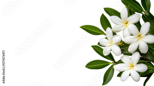 © Kittichet, Obraz premium Elegant White Flowers with Green Leaves on Dark Background