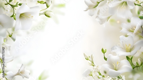 Fototapeta premium Elegant white freesia floral background with blossoms and petals in natural...