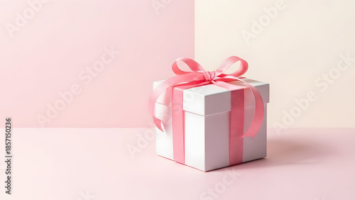 Fototapeta premium Elegant white gift box adorned with a soft pink ribbon and bow on a pastel pink background