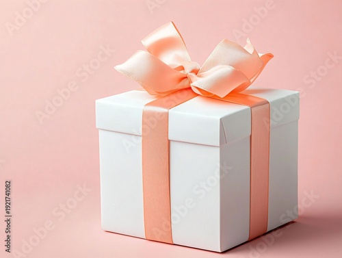 © Jeerawat, Obraz premium Elegant white gift box with coral ribbon on soft pink background